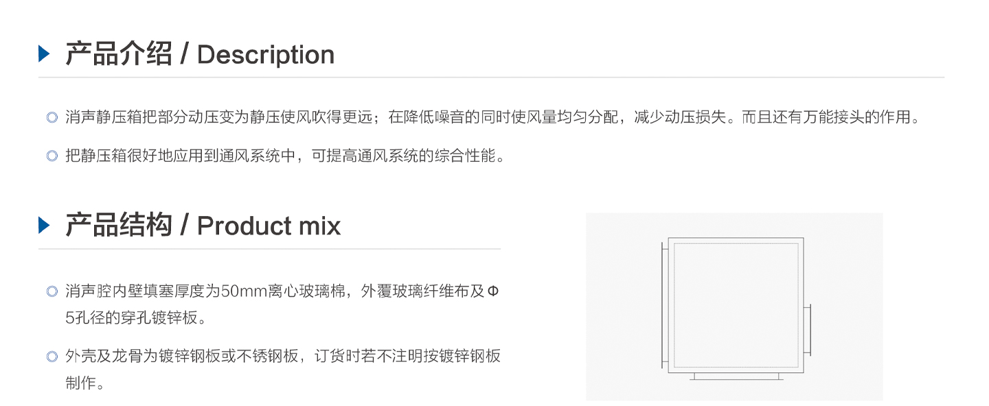 靜壓箱是通風(fēng)空調(diào)系統(tǒng)中必不可少的空調(diào)配件,它與風(fēng)口或散流器配套使用,能消除出口處的氣流噪聲,在系統(tǒng)中配置靜壓箱可以增加系統(tǒng)的靜壓,穩(wěn)定氣流,達(dá)到理想的空調(diào)效果。外殼采用鍍鋅鋼板,內(nèi)襯30%穿孔鍍鋅板,吸聲材料為玻璃纖維布包,覆超細(xì)玻璃棉。