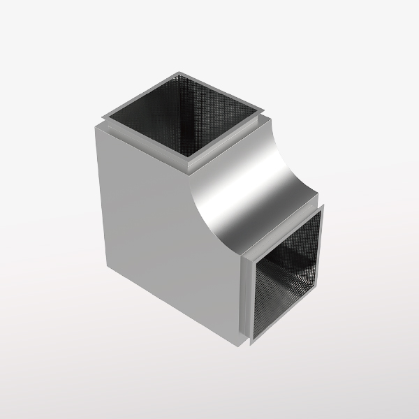本消聲彎頭采用外角內(nèi)圓結(jié)構(gòu),有利于提高消聲效果,減小阻力損失,降低再生噪音,外殼采用鍍鋅板。 吸聲材料為玻璃布包超細(xì)玻璃棉,保證吸聲材料在高速氣流下的穩(wěn)定性。